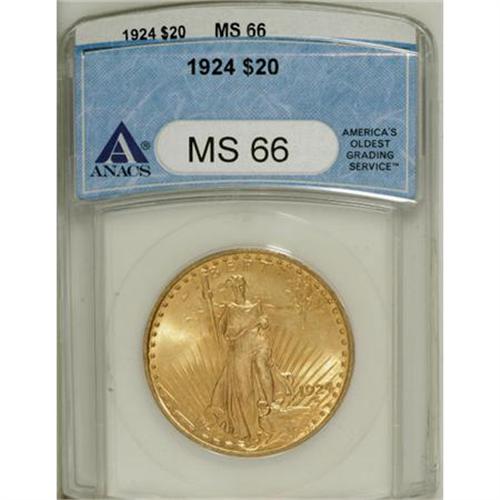 <B>1924 $20 MS66 ANACS.</B></I> Orange and green-gold shadings alternate across this shimmering and precisely struck gold type coin. An attractive representative that lacks mentionable contact.<BR><BR><b>Shipping:</b> Coins & Currency (<a target="_blank" href="http://www.heritageauctions.com/common/shipping.php">view shipping information</a>)