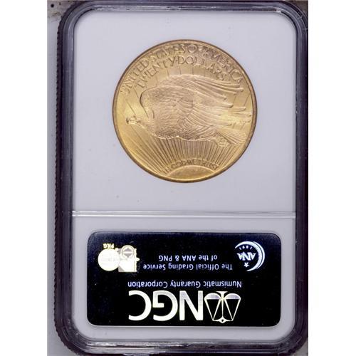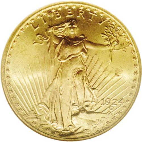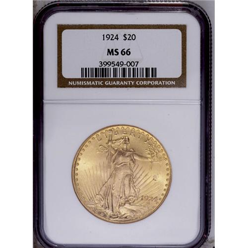 <B>1924<$20> MS66 NGC.</B></I> Sharply struck with frosty and highly lustrous yellow-gold surfaces. The devices, especially on the reverse, have acquired faint orange color. A lovely example. <BR><BR><B>Importa