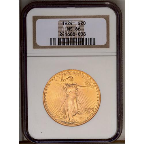 <B>1924<$20> MS66 NGC.</B></I> A coin of obvious originality with attractive peach-gold hues. Rich gleaming luster and virtually mark-free surfaces ensure the coin's status as a Premium Gem.