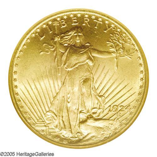 <B>1924<$20> MS66 NGC.</B></I> An exceptional Premium gem example with highly lustrous yellow-gold surfaces. All of the design elements are fully defined. This is a frosty beauty that will please almost any collector.