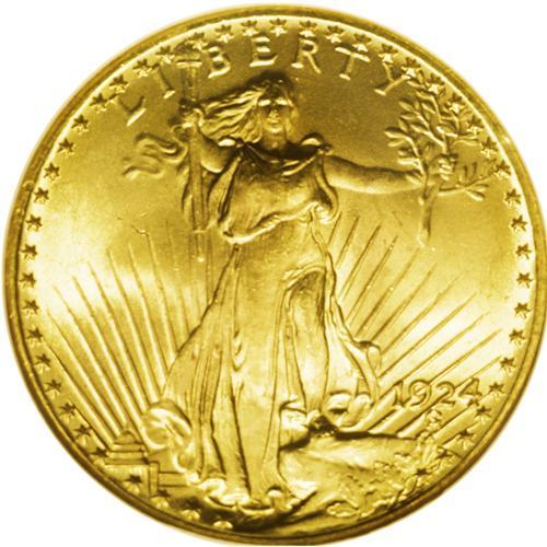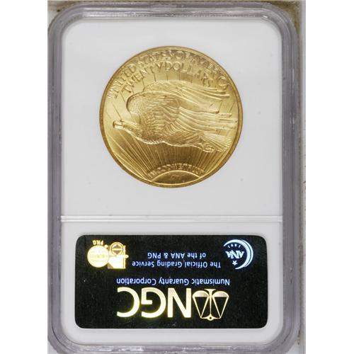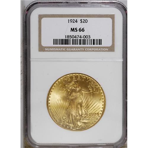 <B>1924<$20> MS66 NGC.</B></I> As of (9/06), this issue in MS66 has seen 3,101 examples certified at NGC, with 94 finer, and 5,792 pieces at PCGS, with 72 finer. While a combined NGC/PCGS population approaching 9,000 MS66 pieces might seem like a lot of coins, consider this fact that may add perspective: Those services together have certified 326,201 pieces of this issue in MS63 or better, well over a quarter of a million pieces. Including coins in the lower Mint State grades, the total swells to almost 400,000 examples at both services. Accordingly, this MS66 example is <I>among the top 2.24% of all Mint State pieces certified,</B></I> almost in the 98th percentile. This coin certainly appears high-end even for the grade, offering lustrous, fine-grained orange-gold surfaces, a bold strike, and minimal abrasions.