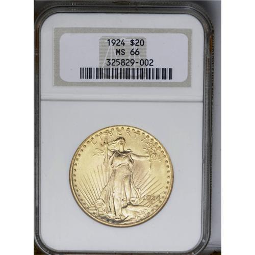<B>1924<$20> MS66 NGC.</B></I> Booming luster graces this smooth and assertively struck Premium Gem. The 1924 makes frequent auction appearances, but quality examples of this enormously popular type are desired by both collectors and gold hoarders. Certified in an older generation NGC holder.