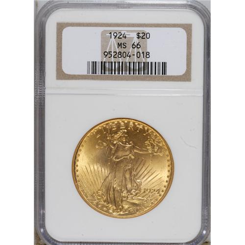 <B>1924 $20 MS66 NGC.</B></I> Both sides of this splendid double eagle have satiny yellow-gold luster and sharp design features. It possesses excellent eye appeal.<BR><BR><b>Shipping:</b> Coins & Currency (<a target="_blank" href="http://www.heritageauctions.com/common/shipping.php">view shipping information</a>)