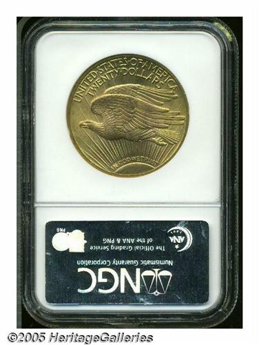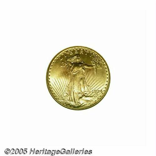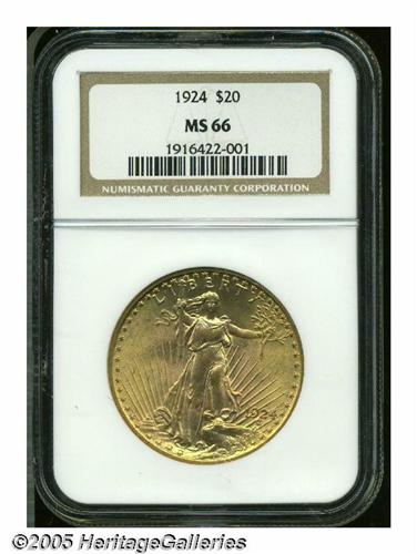 <B>1924<$20> MS66 NGC.</B></I> Flashy mint luster and original reddish tinged coloration are combined with clean surfaces and bold striking details to make this an impressive MS66 type coin.