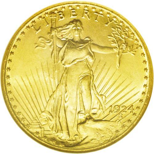 <B>1924<$20> MS66 NGC.</B></I> Fully brilliant surfaces with rich yellow-gold luster, tending toward orange color. Although a few insignificant surface marks are present, this is a solid example for the grade.
