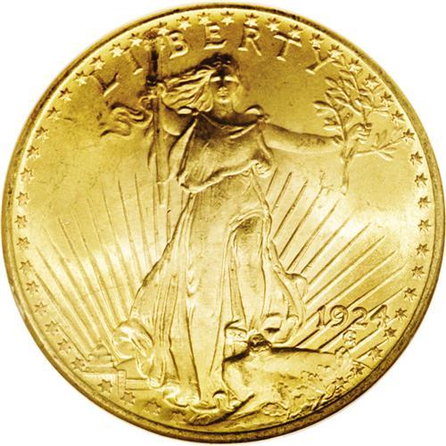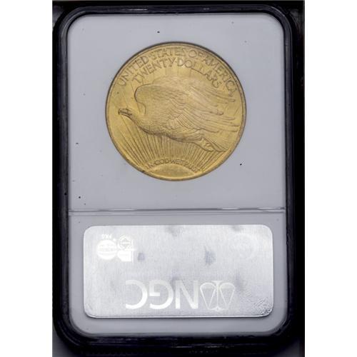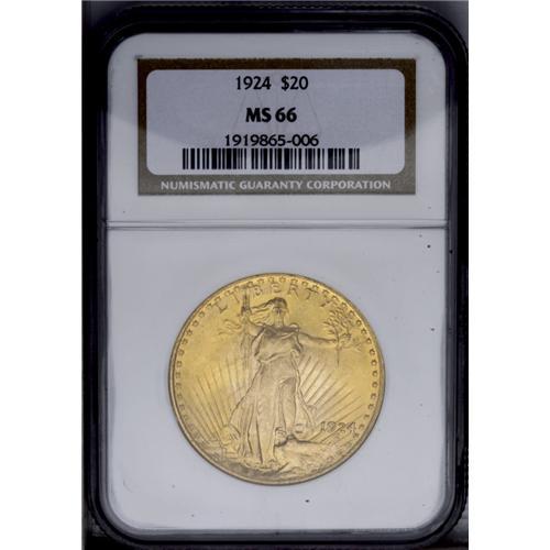 <B>1924<$20> MS66 NGC.</B></I> Fully lustrous with bright orange-gold coloration. The strike is above average for the issue and both sides display an exceptionally clean appearance. <BR><BR><B>Important notice:</B> Heritage usually auctions material at the rate of 200-250 lots per hour. On some occasions eBay Live bid software or the Internet may not be able to keep up with the pace of the auction. We recommend placing a realistic absentee bid now as insurance to avoid disappointment. Occasionally the auctioneer may eliminate or reject an eBay Live bid, and the auctioneer may also reopen a lot after the close of the eBay live bidding (usually because we missed an audience bid), and may reject your bid even if it shows you as the winning bidder. By bidding via eBay Live, you agree that Heritage may award the lot to another bidder at its sole discretion under the circumstances described above or any other reasonable circumstances. Since eBay bids are not shown to us until we open the lot on the floor, we treat those bids just like floor bids. In most cases the floor responds before the eBay bid is presented to us, due to Internet lag time, so for consistency we have made it a policy that floor bids are always considered first over tie eBay live bids. Also please note that all Heritage lots purchased through eBay Live carry a 20% Buyer's Premium. Please make sure you read the Terms and Conditions before you bid. This lot is being auctioned in conjunction with a live floor auction by Heritage Galleries & Auctioneers. All final auction and invoice information will be supplied by Heritage Galleries & Auctioneers, and all other information should be considered preliminary. Lot:4715 <BR><BR><B>Winning Notification and Billing:</B> After the FINAL session in this auction is complete, Heritage will send e-mail and snail mail invoices. This process normally takes several days. All final auction and invoice information will be supplied by Heritage Galleries & Auctioneers, and all other information should be considered preliminary. <BR><BR>This auction will be conducted on a live auction floor and over the Internet through eBay Live. If you choose to place an absentee bid, please take a moment to <font color='#0000ff'><u><a href='http://pages.ebay.com/liveauctions/help/before/laabsentee.html'>learn how eBay Live absentee bidding works</a></u></font><font color='#000000'>