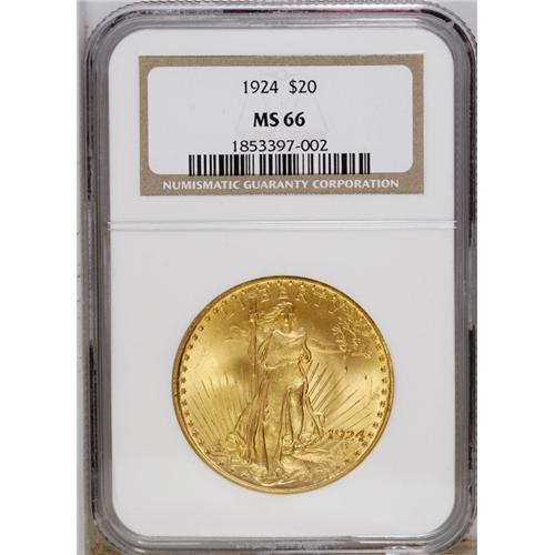 <B>1924 $20 MS66 NGC.</B></I> Glowing luster shines through wheat-gold patina on this sharply struck twenty dollar that exhibits a matte-like finish. A few minute marks do not detract.<BR><BR><b>Shipping:</b> Coin/Currency (<a target="_blank" href="http://www.heritageauctions.com/common/shipping.php">view shipping information</a>)