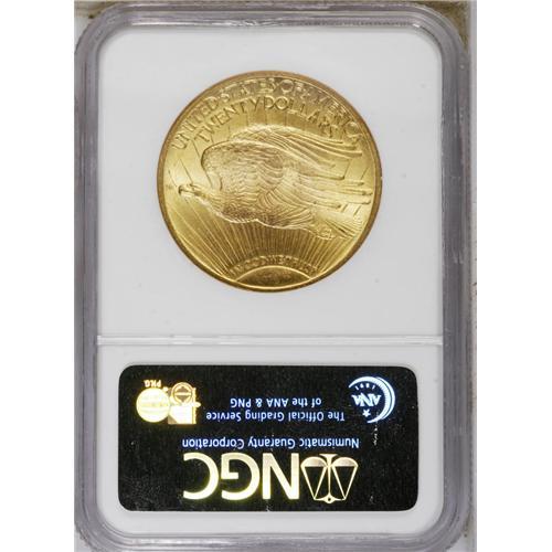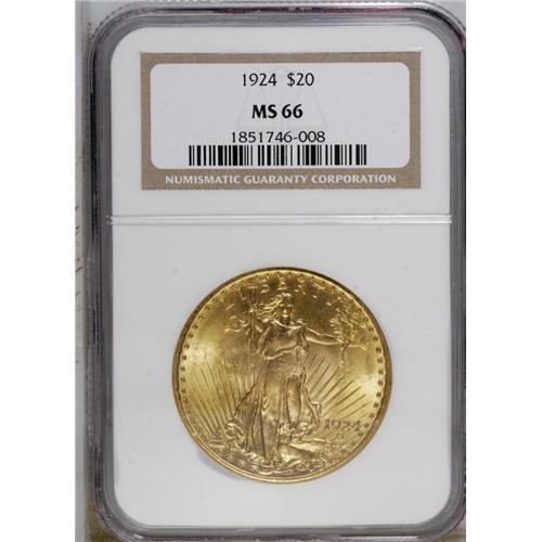 <B>1924<$20> MS66 NGC.</B></I> It is a shame that type coins of such high quality (and fairly reasonable price) do not exist in more U.S. coin series. Nonetheless, legions of collectors are glad for the existence of Premium Gem 1924 double eagles, among a couple of other available dates. The present example offers a lustrous combination of orange-gold and green-gold.
