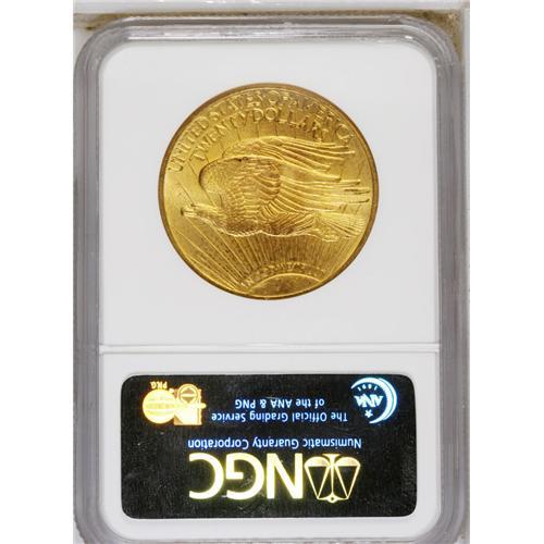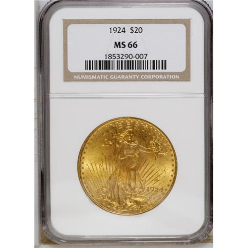 <B>1924 $20 MS66 NGC.</B></I> Lovely apricot-gold patina adorns lustrous surfaces The design elements have been sharply impressed, including Liberty's face, fingers, and toes, along with the Capitol building. Light abrasions on the reverse sun are pointed out for accuracy.<BR><BR><b>Shipping:</b> Coin/Currency (<a target="_blank" href="http://www.heritageauctions.com/common/shipping.php">view shipping information</a>)