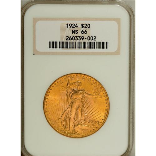 <B>1924 $20 MS66 NGC.</B></I> Lovely reddish-gold color blankets both sides of this uncommonly well preserved example. The sharply impressed and fully lustrous surfaces beg inclusion into a premium quality Gem type set.<BR><BR><b>Shipping:</b> Coin/Currency (<a target="_blank" href="http://www.heritageauctions.com/common/shipping.php">view shipping information</a>)