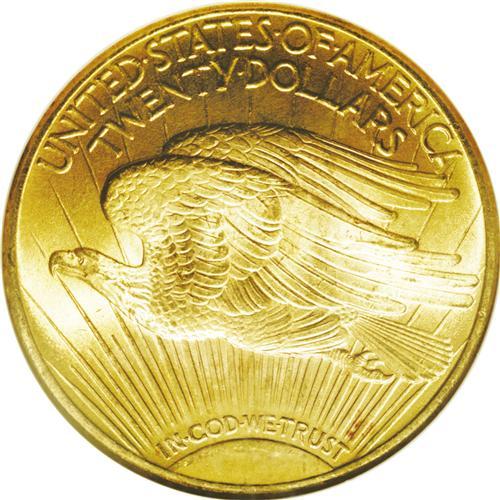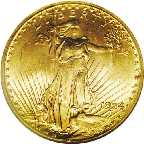 <B>1924<$20> MS66 NGC.</B></I> Sharply defined throughout with thick orange-gold mint frost. There are a few tiny alloy spots on each side from improper mixture of the gold and copper alloy. Several small abrasions serve to limit the already high grade.