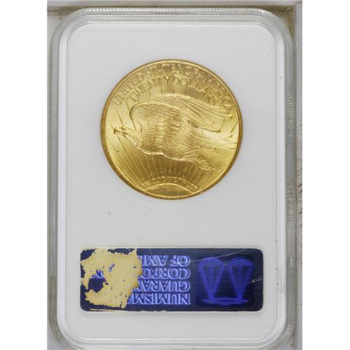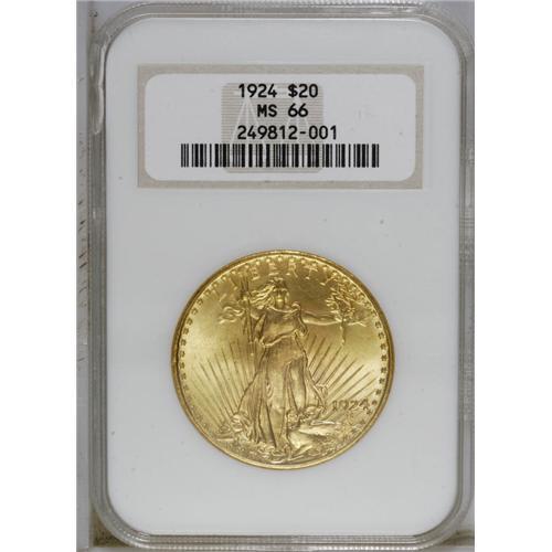 <B>1924<$20> MS66 NGC.</B></I> This delightful green-gold Premium Gem displays vibrant cartwheel sheen. Marks are too trivial to mention, and the strike is bold save for the top of the sun and the center of the Capitol building. Encapsulated in an early generation holder. A small piece has broken off the front upper left portion of the holder, which has no impact on the coin's exemplary preservation.