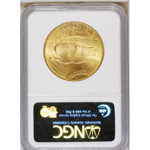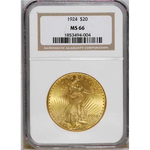 <B>1924 $20 MS66 NGC.</B></I> This example displays a slightly greenish mellow tone of golden radiance. It is frosted and very attractive. There is one noted contact mark on Liberty's left leg worth mention, but overall an impressive appearance and lofty grade for this Philadelphia Mint issue.<BR><BR><b>Shipping:</b> Coin/Currency (<a target="_blank" href="http://www.heritageauctions.com/common/shipping.php">view shipping information</a>)