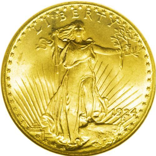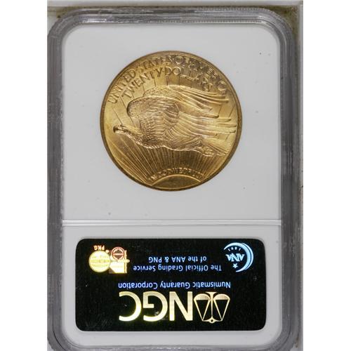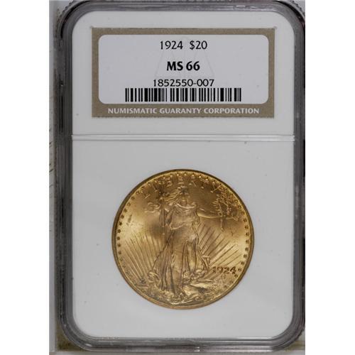 <B>1924<$20> MS66 NGC.</B></I> This lovely example boasts flashy antique-gold surfaces with radiant cartwheel luster. The mattelike, fine-grained surfaces show an exceptionally bold strike under a loupe, along with a near-total absence of mentionable abrasions. A nice piece, one that verges on a higher grade.