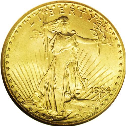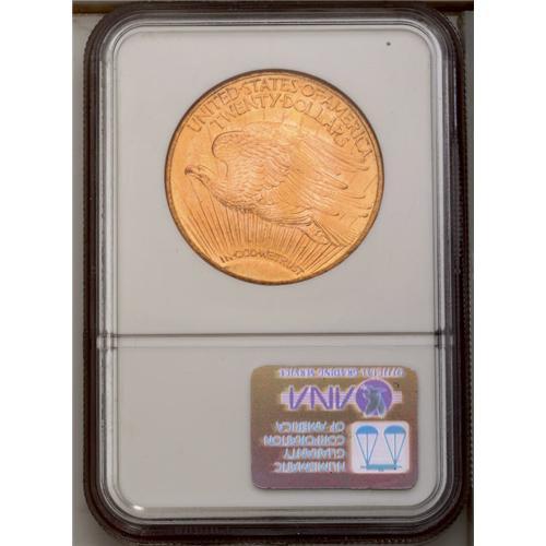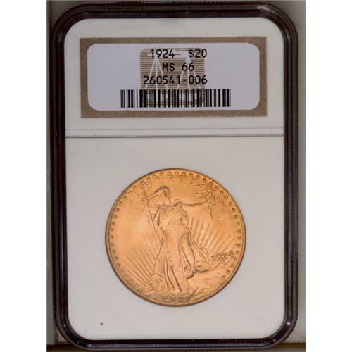 <B>1924<$20> MS66 NGC.</B></I> Well struck and highly lustrous with lovely clean surfaces and beautiful peach-gold coloration. A couple of wispy luster grazes in the obverse fields are located away from the central focal points.