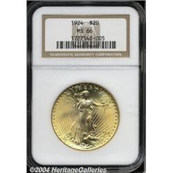 <B>1924<$20> MS66 NGC.</B></I> With billowy mint frost and nary a distracting abrasion to report, this richly colored, yellow-gold example is worthy of inclusion in a Gem quality type set. The sharp strike is free of criticism.<BR><I>From The Garden State Collection.</B></I> <BR><BR><B>Important notice:</B> Heritage usually auctions material at the rate of 200-250 lots per hour. On some occasions eBay Live bid software or the Internet may not be able to keep up with the pace of the auction. We recommend placing a realistic absentee bid now as insurance to avoid disappointment. Occasionally the auctioneer may eliminate or reject an eBay Live bid, and the auctioneer may also reopen a lot after the close of the eBay live bidding (usually because we missed an audience bid), and may reject your bid even if it shows you as the winning bidder. By bidding via eBay Live, you agree that Heritage may award the lot to another bidder at its sole discretion under the circumstances described above or any other reasonable circumstances. Since eBay bids are not shown to us until we open the lot on the floor, we treat those bids just like floor bids. In most cases the floor responds before the eBay bid is presented to us, due to Internet lag time, so for consistency we have made it a policy that floor bids are always considered first over tie eBay live bids. Also please note that all Heritage lots purchased through eBay Live carry a 20% Buyer's Premium. Please make sure you read the Terms and Conditions before you bid.