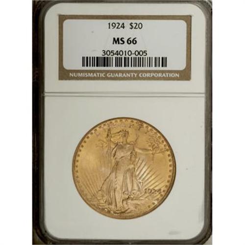 <B>1924 $20 MS66 NGC.</B></I> The strongly lustrous fields are yellow-orange, while the well-defined devices are primarily sun-gold. Excellent eye appeal and distinctly better preservation than the typical Gem.<BR><BR><B>Coin Engraver:</B> Augustus Saint-Gaudens<BR><BR><b>Shipping:</b> Coins & Currency (<a target="_blank" href="http://www.heritageauctions.com/common/shipping.php">view shipping information</a>)