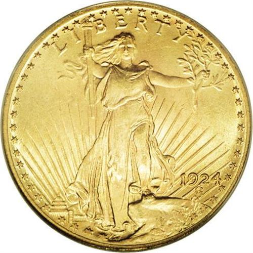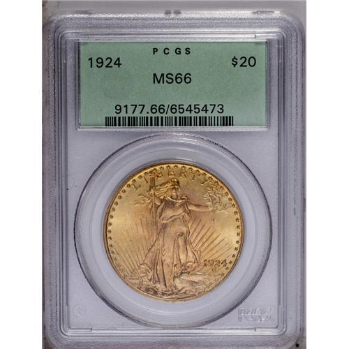 <B>1924<$20> MS66 PCGS.</B></I> This is a splendid example that features satiny luster rather than the usual frosty luster. The surfaces have rich orange-gold luster with hints of pinkish accents. <BR><BR><B>Importan