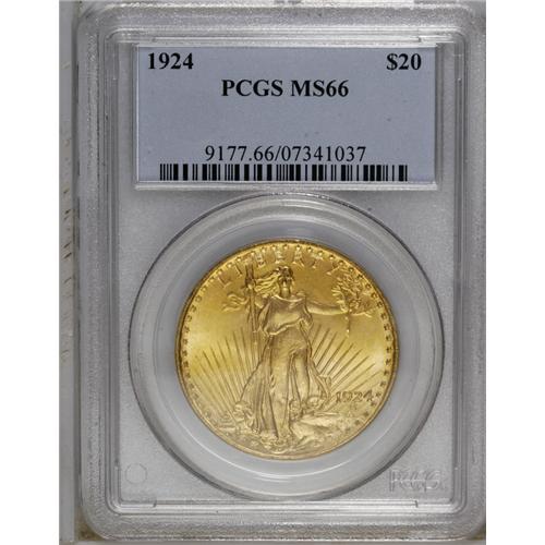 <B>1924 $20 MS66 PCGS.</B></I> A clear step above Gem, this piece has pleasing luster and attractive yellow-orange surfaces that pale to canary-yellow near the center. The devices are well-defined and free of mentionable distractions.<BR><BR><b>Shipping:</b> Coin/Currency (<a target="_blank" href="http://www.heritageauctions.com/common/shipping.php">view shipping information</a>)