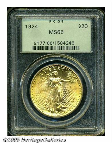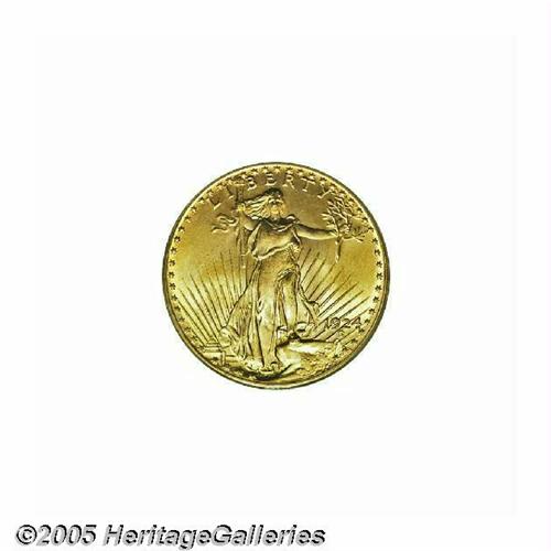 <B>1924<$20> MS66 PCGS.</B></I> A magnificently preserved Double Eagle. Radiant lemon-gold cartwheel luster sweeps across the refreshingly undisturbed fields. Although 1924 Saint-Gaudens Twenties are anything but rare, the vast majority of these coins possess countless individually minor luster grazes that diminish the eye appeal, unlike the present exemplary example. A few tiny ticks are noted near Liberty's face. In a green label holder.