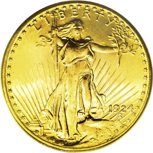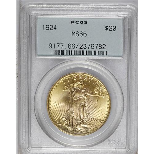 <B>1924<$20> MS66 PCGS.</B></I> A remarkably attractive Premium Gem that is essentially without the tiny marks that tend to collect on these bag-stored large denomination gold coins. Although 1924 double eagles are undeniably common, only a minuscule portion of survivors can compete with the eye appeal of the present piece. Housed in an old green label holder.