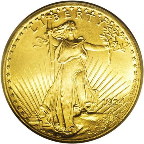 <B>1924<$20> MS66 PCGS.</B></I> A superlative choice for a high-grade type set, this lovely Premium Gem Saint-Gaudens twenty boasts radiant cartwheel luster, a bold strike, and a near-total lack of mentionable abrasions. The only quibble is a bit of strike weakness on the 4 in the date and the nearby stars. A nice piece overall, and seldom seen finer.