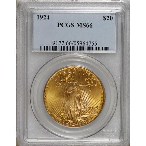 <B>1924 $20 MS66 PCGS.</B></I> An attractive peach-gold and orange piece that represents a clear step up from a typical Gem example. Strongly defined with a lacy copper spot above Liberty's shoulder.<BR><BR><b>Shipping:</b> Coins & Currency (<a target="_blank" href="http://www.heritageauctions.com/common/shipping.php">view shipping information</a>)