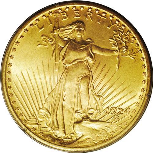 <B>1924<$20> MS66 PCGS.</B></I> An outstanding Saint-Gaudens type coin. Thousands of Uncirculated 1924 double eagles managed to escape the furnaces after Roosevelt's gold recall, but these pieces were strictly regarded as bullion, and were indifferently stored and shipped. The present Premium Gem shows no evidence of such treatment, since the surfaces are exemplary. In fact, the grade is limited only by slight striking softness on peripheral elements. Housed in a first generation holder.