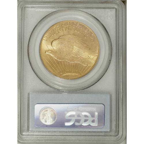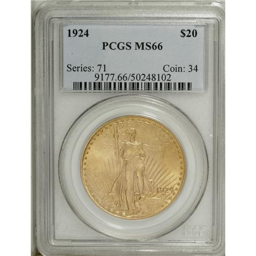 <B>1924 $20 MS66 PCGS.</B></I> Attractive yellow-gold surfaces are imbued with traces of khaki, and exhibit pleasing luster. A powerful strike emboldens the design features that display excellent definition on Liberty's face, fingers, and toes. Both sides are wonderfully preserved.<BR><BR><b>Shipping:</b> Coin/Currency (<a target="_blank" href="http://www.heritageauctions.com/common/shipping.php">view shipping information</a>)