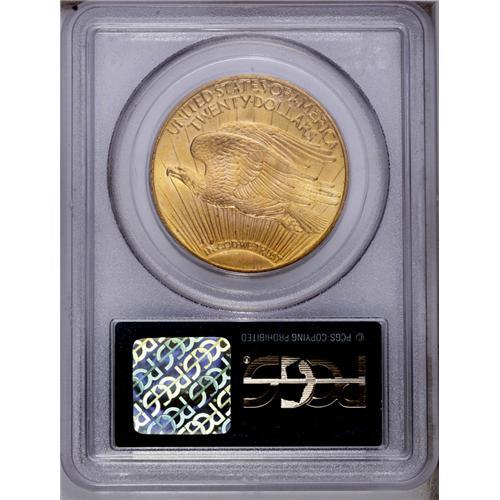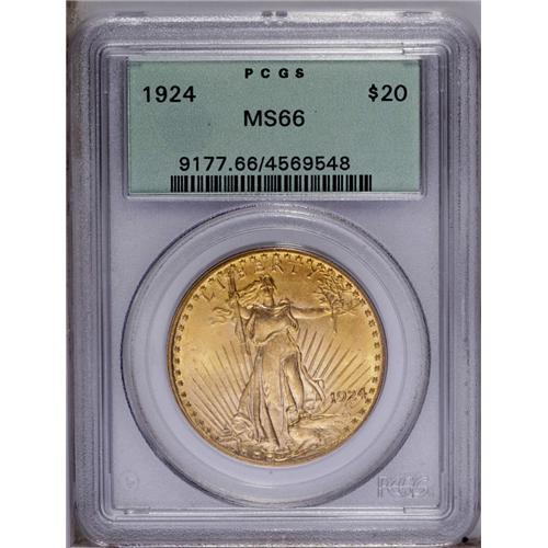 <B>1924<$20> MS66 PCGS.</B></I> Beautifully frosted with nary a distracting bagmark to report, this colorful Gem combines golden-rose and orange-gold shadings. Both sides are sharply struck, and a couple of small marks in the right obverse field are noted. Housed in an earlier PCGS holder with a green insert. <BR><BR><B>Important notice:</B> Heritage usually auctions material at the rate of 200-250 lots per hour. On some occasions eBay Live bid software or the Internet may not be able to keep up with the pace of the auction. We recommend placing a realistic absentee bid now as insurance to avoid disappointment. Occasionally the auctioneer may eliminate or reject an eBay Live bid, and the auctioneer may also reopen a lot after the close of the eBay live bidding (usually because we missed an audience bid), and may reject your bid even if it shows you as the winning bidder. By bidding via eBay Live, you agree that Heritage may award the lot to another bidder at its sole discretion under the circumstances described above or any other reasonable circumstances. Since eBay bids are not shown to us until we open the lot on the floor, we treat those bids just like floor bids. In most cases the floor responds before the eBay bid is presented to us, due to Internet lag time, so for consistency we have made it a policy that floor bids are always considered first over tie eBay live bids. Also please note that all Heritage lots purchased through eBay Live carry a 20% Buyer's Premium. Please make sure you read the Terms and Conditions before you bid. This lot is being auctioned in conjunction with a live floor auction by Heritage Galleries & Auctioneers. All final auction and invoice information will be supplied by Heritage Galleries & Auctioneers, and all other information should be considered preliminary. Lot:4711 <BR><BR><B>Winning Notification and Billing:</B> After the FINAL session in this auction is complete, Heritage will send e-mail and snail mail invoices. This process normally takes several days. All final auction and invoice information will be supplied by Heritage Galleries & Auctioneers, and all other information should be considered preliminary. <BR><BR>This auction will be conducted on a live auction floor and over the Internet through eBay Live. If you choose to place an absentee bid, please take a moment to <font color='#0000ff'><u><a href='http://pages.ebay.com/liveauctions/help/before/laabsentee.html'>learn how eBay Live absentee bidding works</a></u></font><font color='#000000'>