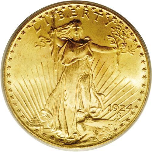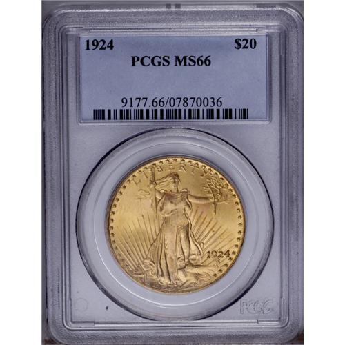 <B>1924<$20> MS66 PCGS.</B></I> Boldly struck and exceedingly lustrous with lovely yellow-gold, mint-green, and peach coloration intermingled over both sides. An expertly preserved and aesthetically pleasing Premium Gem.