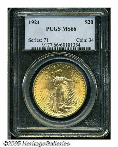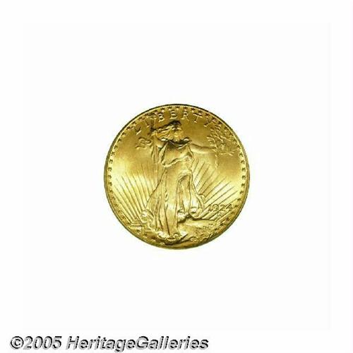 <B>1924<$20> MS66 PCGS.</B></I> Bright yellow-gold color overlays each side. Sharply defined throughout with only minimal marks. The fields are extremely clean with only a few light marks under the eagle.