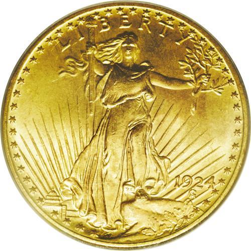 <B>1924<$20> MS66 PCGS.</B></I> Fully struck with remarkably clean surfaces that display subtly variegated orange-gold and lilac patina. A lovely, high grade type coin.