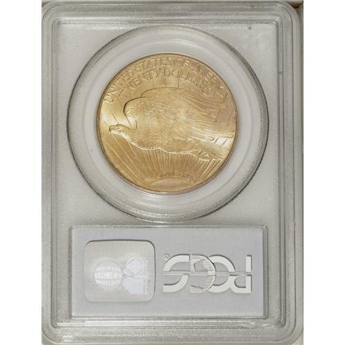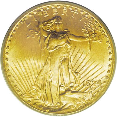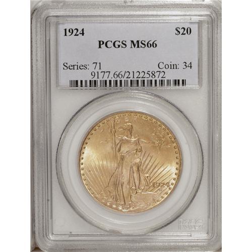 <B>1924<$20> MS66 PCGS.</B></I> Lovely reddish-gold color blankets both sides of this uncommonly well preserved example. Mint-green border accents enhance the coin's eye appeal. The sharply impressed and fully lustrous surfaces would do wonders for a Premium Gem type set. Abrasions are typically minimal for the assigned grade.