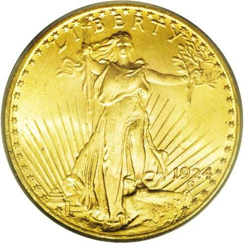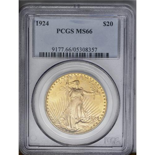 <B>1924<$20> MS66 PCGS.</B></I> Lustrous pale yellow with exceptional eye appeal. Sharply struck with satiny surfaces. This is a wonderful example of the design, a coin ideal for date or type collectors.