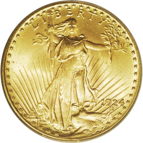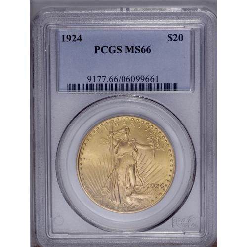 <B>1924 $20 MS66 PCGS.</B></I> Pronounced green-gold coloration characterizes this high grade, frosted double eagle. The striking details are sharp throughout, and this is a highly lustrous coin.