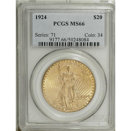 <B>1924 $20 MS66 PCGS.</B></I> Radiant luster adorns each side of this peach-gold twenty, and all of the design elements are well brought up. Minimally abraded for the grade level.<BR><BR><b>Shipping:</b> Coin/Currency (<a target="_blank" href="http://www.heritageauctions.com/common/shipping.php">view shipping information</a>)