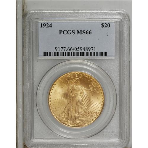 <B>1924 $20 MS66 PCGS.</B></I> Soft mint frost and bold striking details endow this pleasingly toned Premium Gem with a lovely, elegant appearance. A few wispy marks and luster grazes fail to impair the visual appeal or the technical grade of the piece.<BR><BR><b>Shipping:</b> Coins & Currency (<a target="_blank" href="http://www.heritageauctions.com/common/shipping.php">view shipping information</a>)