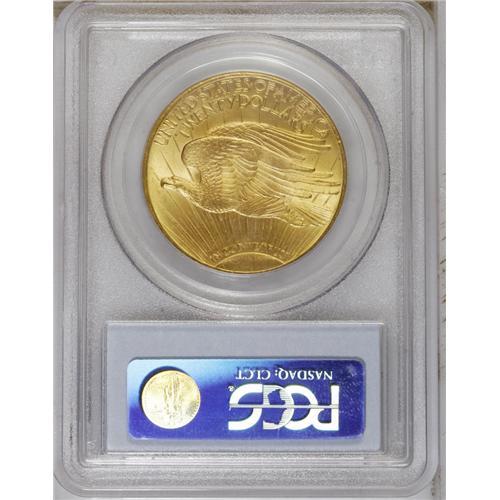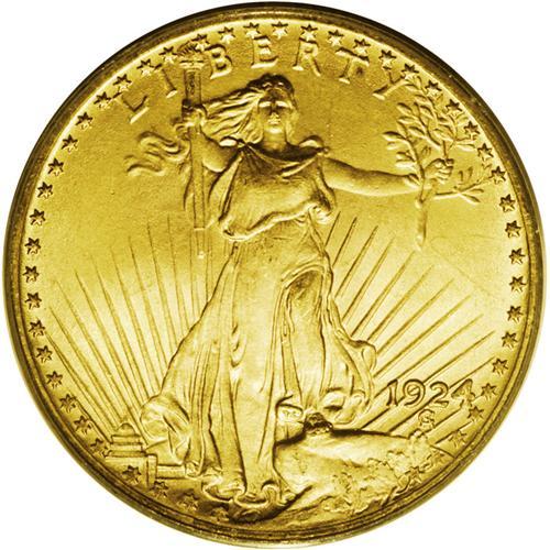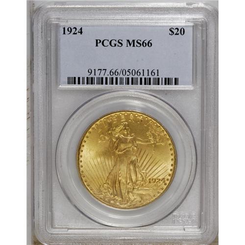 <B>1924<$20> MS66 PCGS.</B></I> The 1924 and 1928 double eagles are among the most plentiful and beautiful Saint-Gaudens issues in Mint State. This example offers effulgent luster over satiny, matte-like straw-gold surfaces. The strike is bold, and examination with a glass fails to find any mentionable distractions. A nice one! PCGS has graded 72 pieces finer (9/06).