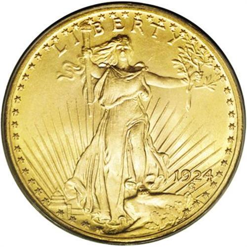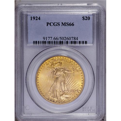 <B>1924<$20> MS66 PCGS.</B></I> There are a few tiny luster breaks at the center of the reverse, but one hardly notices these as the luster is so thick and luxuriant, varying in color from pale pink to deeper orange-gold. Fully defined with a crisp, medal-like strike in all areas.