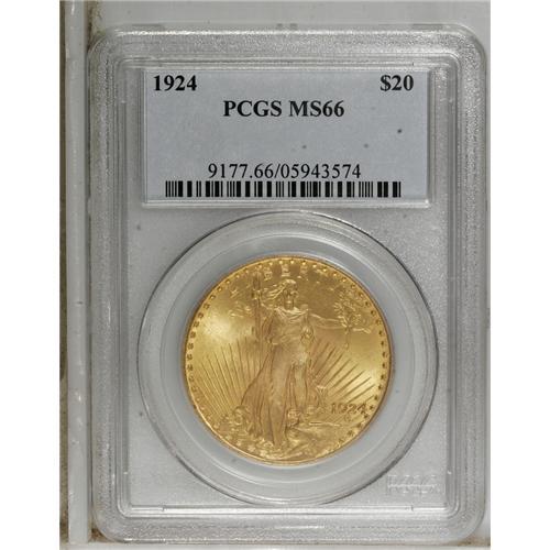 <B>1924 $20 MS66 PCGS.</B></I> This Premium Gem displays soft luster and tan-gold coloration on a fine-grain finish. Exquisitely struck throughout, with just a few minor marks preventing an even higher grade.<BR><BR><b>Shipping:</b> Coins & Currency (<a target="_blank" href="http://www.heritageauctions.com/common/shipping.php">view shipping information</a>)