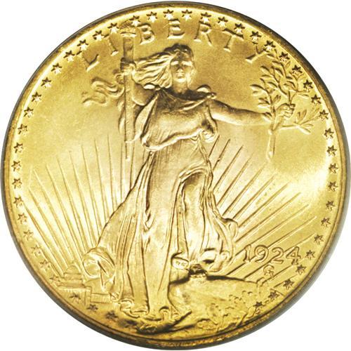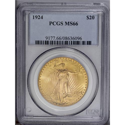 <B>1924<$20> MS66 PCGS.</B></I> This coin's overall eye appeal is extraordinary. A solidly struck example that has ample luster, it has peach-gold surfaces that betray only the tiniest of flaws. Other pieces may be more flashy or more deeply impressed, but few have the combination of strike, luster, and preservation that elevates this double eagle.
