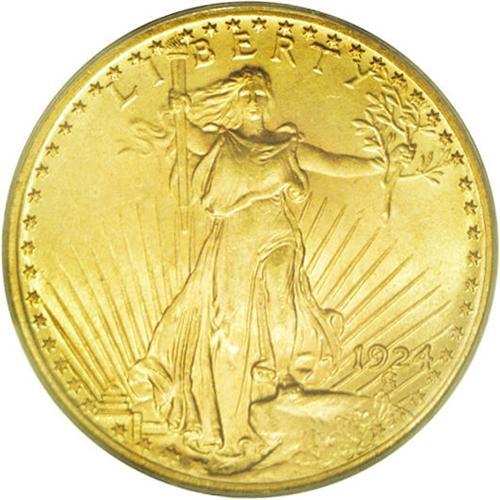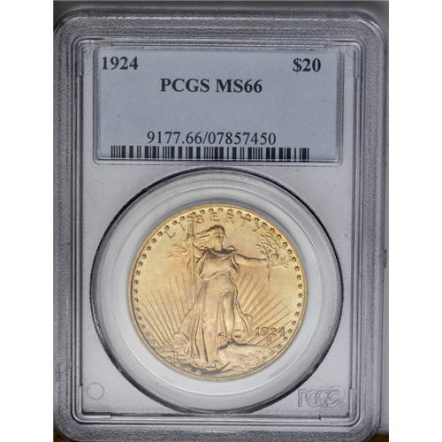 <B>1924<$20> MS66 PCGS.</B></I> This is a splendid example that features satiny luster rather than the usual frosty luster. The surfaces have rich orange-gold luster with hints of pink color.