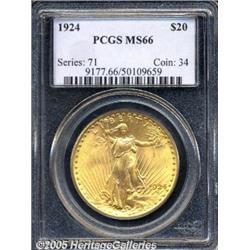 <B>1924 $20 MS66 PCGS.</B></I> This is an outstanding Premium Gem type coin. The surfaces are nearly free from abrasions and contact marks, and the striking details are intricately defined. Rich orange-gold mint frost rolls around the coin in a cartwheel fashion and adds even more to the overall eye appeal of this lovely double eagle.