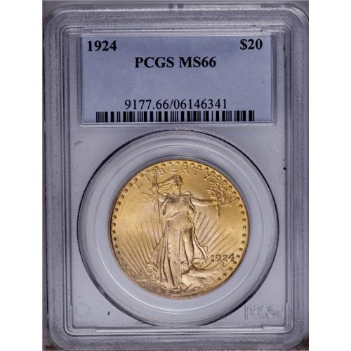 <B>1924<$20> MS66 PCGS.</B></I> With billowy mint frost and nary a distracting abrasion to report, this richly colored, somewhat variegated, antique-gold example is worthy of inclusion in any Gem quality type set. The sharp strike is also free of criticism.