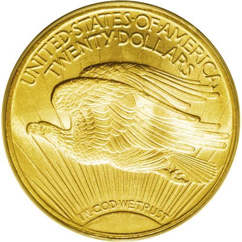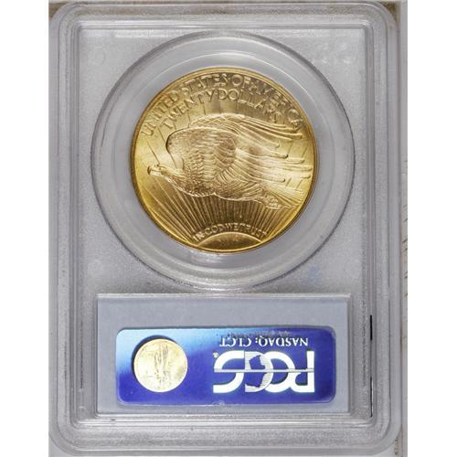 <B>1924<$20> MS66 PCGS.</B></I> With the second-highest mintage of this series (roughly 50,000 more than the 1908 No Motto), it is little wonder that this issue has survived in large numbers and has become a popular type issue. This Premium Gem has attractive honey-gold surfaces and an overall absence of noteworthy marks on the boldly struck devices. Only a few luster scrapes below Liberty's branch arm and on the sun keep this piece from reaching an even higher grade.