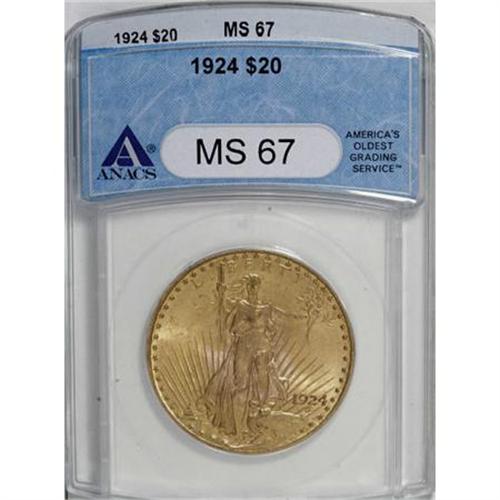 <B>1924 $20 MS67 ANACS.</B></I> The surfaces are wonderfully free from the abrasions that normally plague Saint-Gaudens twenties. Each side is also sharply struck. The mint luster is thick and frosted but initially appears somewhat subdued because of the presence of light patina over each side.<BR><BR><b>Shipping:</b> Coins & Currency (<a target="_blank" href="http://www.heritageauctions.com/common/shipping.php">view shipping information</a>)