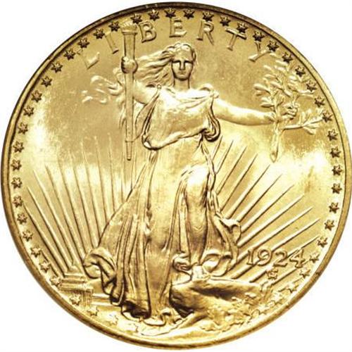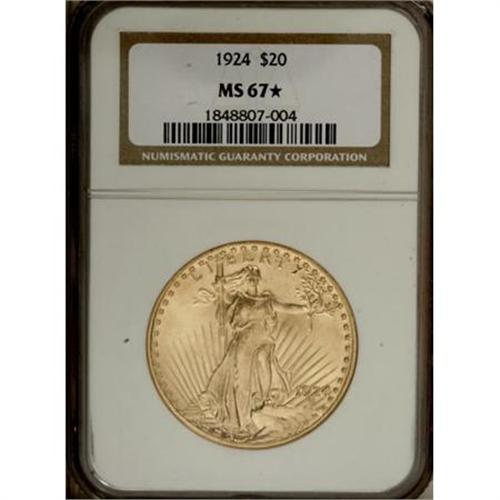 <B>1924 $20 MS67 </B></I><img src="/images/star.gif" width="10" height="10" alt="" border="0"><B> NGC.</B></I> This amazing double eagle has light yellow luster with reflective fields. It is as "prooflike" as a Saint-Gaudens double eagle will ever be found. The design elements are boldly rendered, and the eye appeal, as indicated by the Star designation, is exceptional.<BR><BR><B>Coin Engraver:</B> Augustus Saint-Gaudens<BR><BR><b>Shipping:</b> Coins & Currency (<a target="_blank" href="http://www.heritageauctions.com/common/shipping.php">view shipping information</a>)
