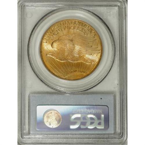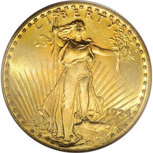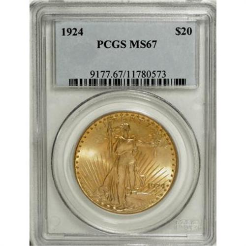 <B>1924 $20 MS67 PCGS.</B></I> A common coin in an uncommon grade, this amazing Superb Gem offers wonderful yellow-gold and wheat-gold surfaces with glints of honey at the margins. The strike is crisp and the surfaces are uncommonly pristine. A top-notch example for one's type or date set. This issue is virtually unobtainable any finer, with NGC and PCGS acknowledging just two such coins between them (7/07).<BR><BR><B>Coin Engraver:</B> Augustus Saint-Gaudens<BR><BR><b>Shipping:</b> Coins & Currency (<a target="_blank" href="http://www.heritageauctions.com/common/shipping.php">view shipping information</a>\)