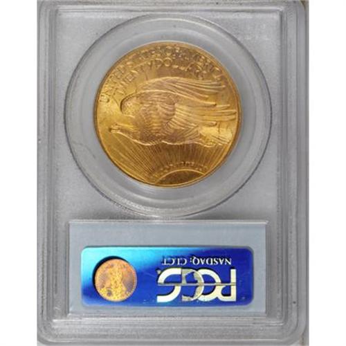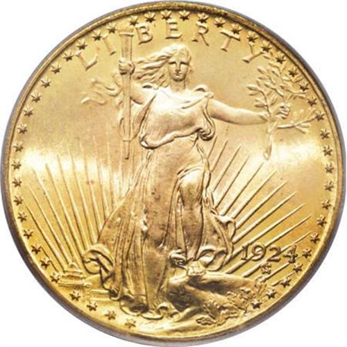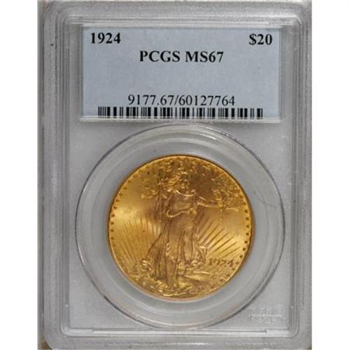 <B>1924 $20 MS67 PCGS.</B></I> The 1924 double eagle, with a mintage of over 4 million pieces, is believed to be the most common of the entire series. Tens of thousands of Uncirculated specimens have been certified by PCGS and NGC; indeed, more than 10,000 coins have been graded MS66! A significant demarcation occurs in the population between MS66 and MS67, however, as fewer than 200 pieces have been assigned the latter grade, and a mere two coins finer! A pretty blend of apricot-gold and mint-green adorns highly lustrous surfaces on this Superb Gem, and the strike has been powerfully executed. Both sides have been impeccably preserved. Population: 81 in 67, 1 finer (8/07).<BR><BR><B>Coin Engraver:</B> Augustus Saint-Gaudens<BR><BR><b>Shipping:</b> Coins & Currency (<a target="_blank" href="http://www.heritageauctions.com/common/shipping.php">view shipping information</a>)
